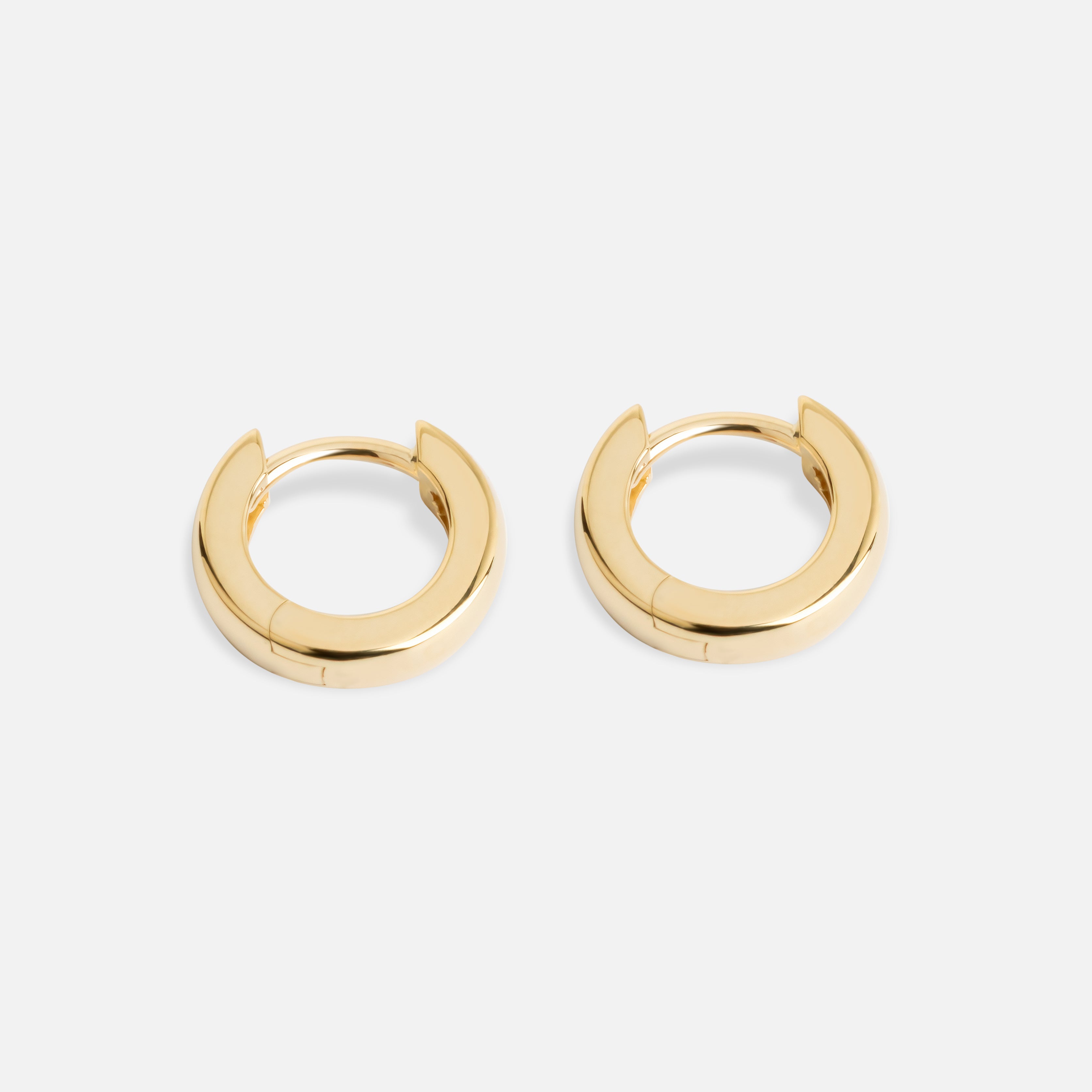 These delicate hoops are crafted from solid gold and designed to fit snugly around the earlobe, providing a subtle yet sophisticated accent. Their minimalist design and extra small size make them perfect for everyday wear or for stacking with other earrings.